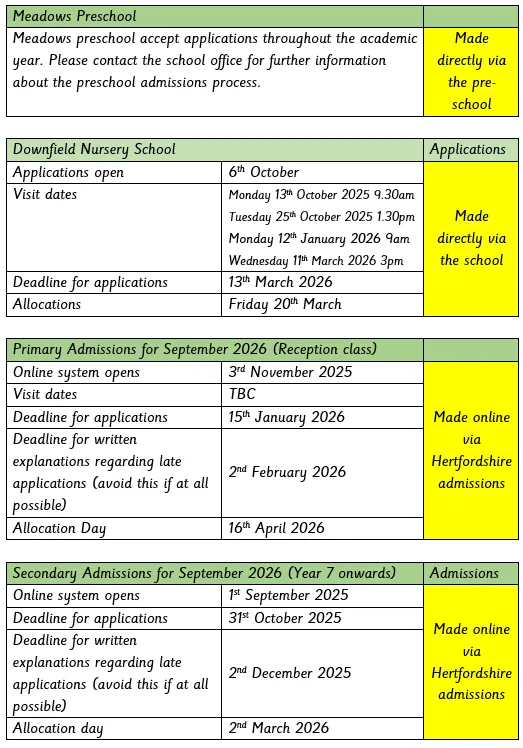 If you have moved to the area and wish to find a school place for your chid, In Year Admissions to Downfield are made via the Local Education Authority - Hertfordshire County Council. Please visit their website here:
